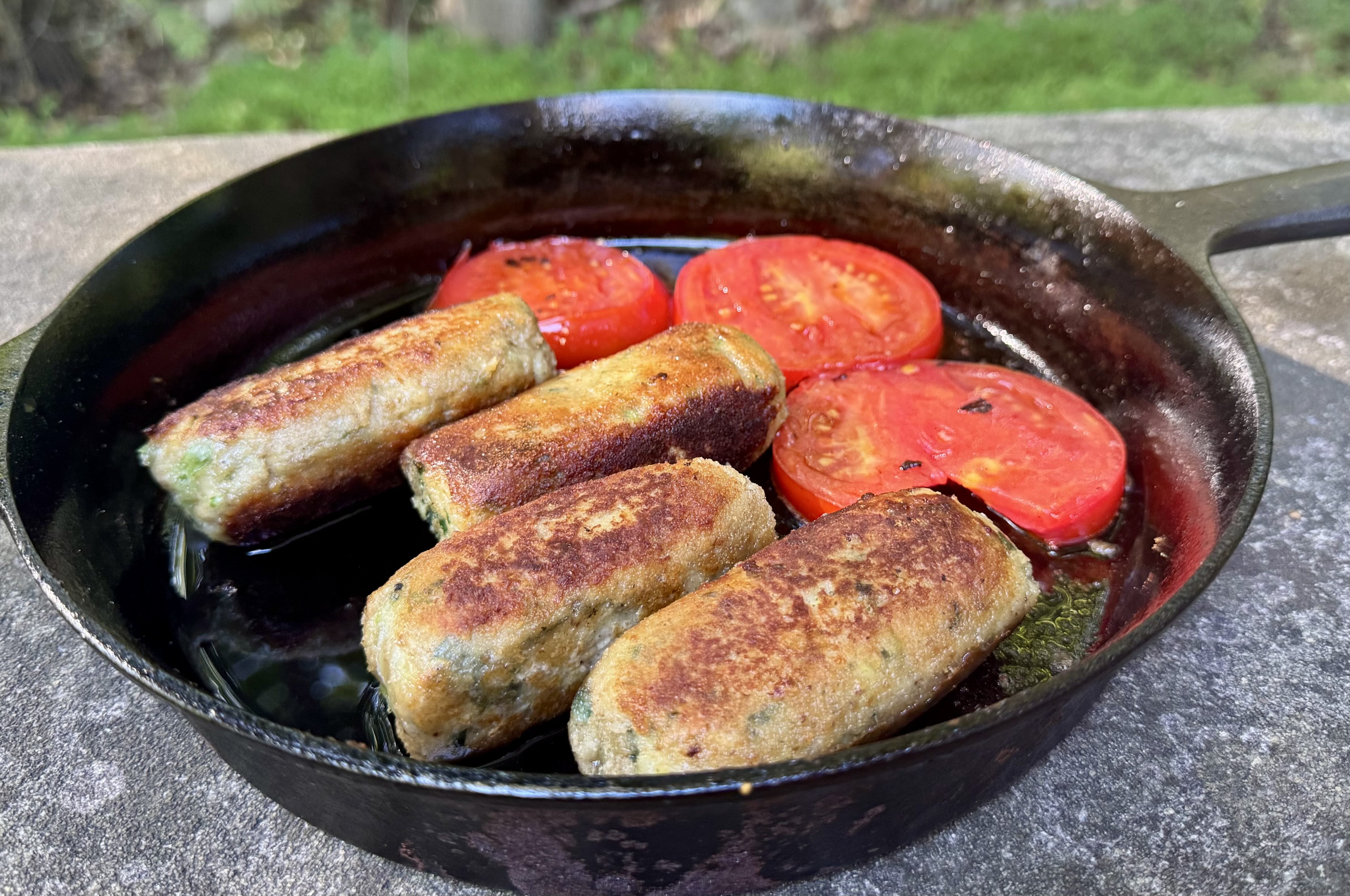 Make yourself a hearty British breakfast by frying ups lots of streaky bacon, then using the fat to fry scrambled eggs, Glamorgan sausages, and slices of red tomato.
