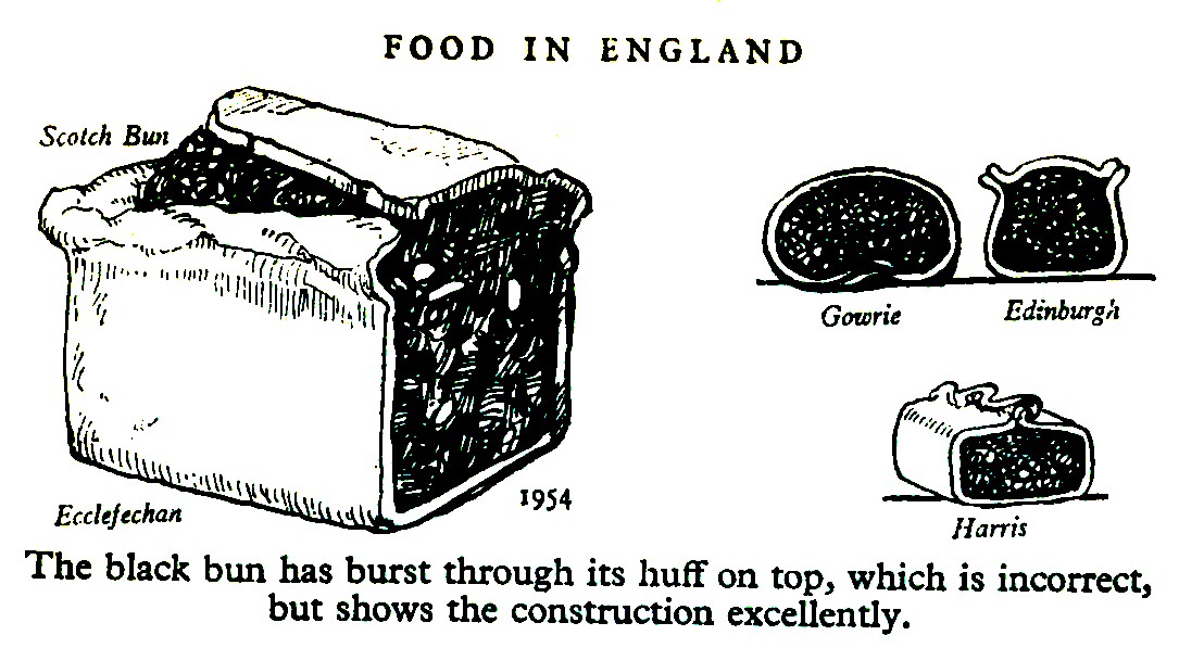 Writing in 1954, Hartley shows regional variation in the shape of the Black Bun: the strict rectangular cake of Ecclefechan, the fat kidney-shaped cake of Gowrie, Edinburgh’s plump loaf, and the decorated loaf of harris.