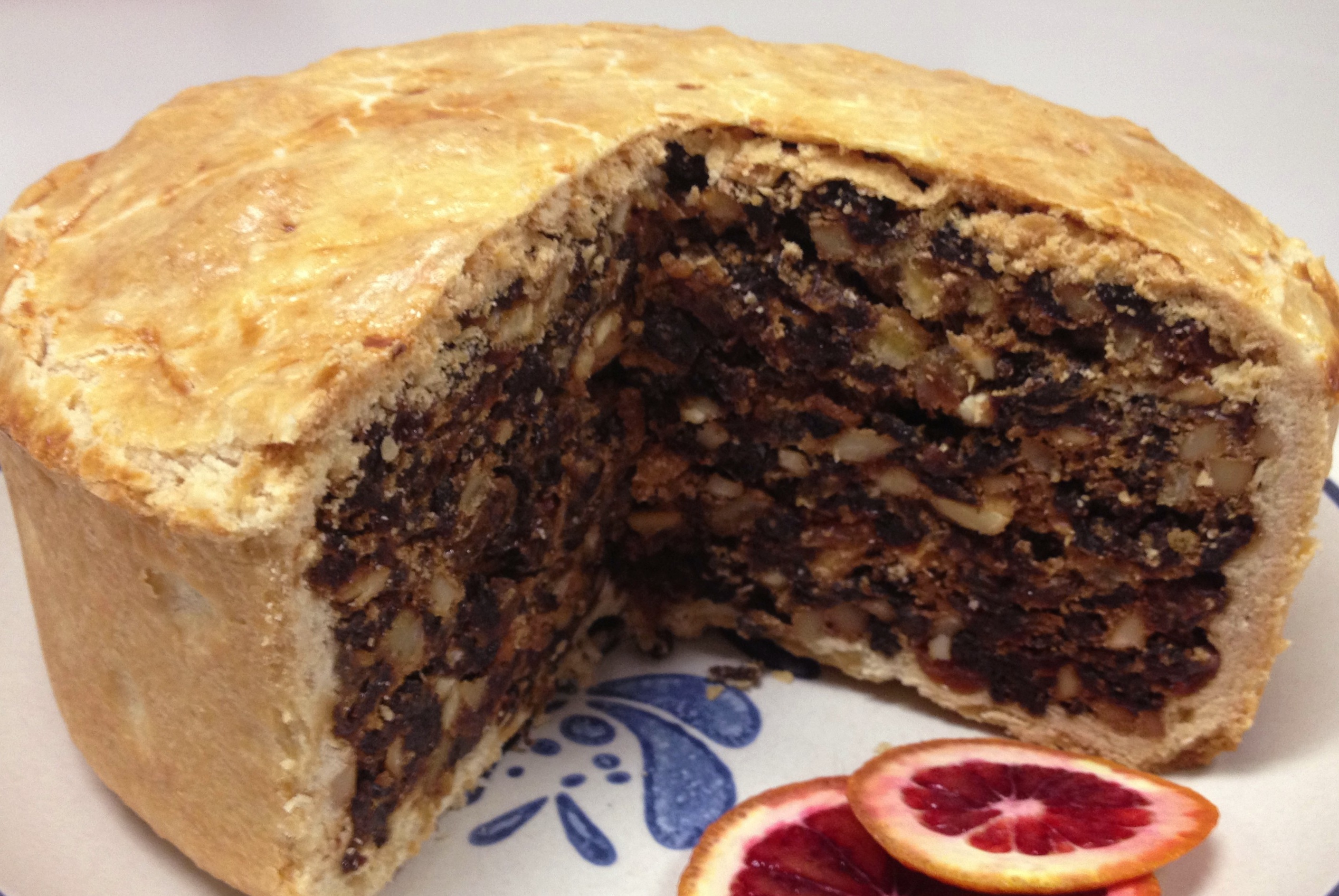 While you work on the pastry shell, preheat the oven to 325°. Crumble the butter into the flour until free of lumps. Stir in enough water to make a firm dough. Roll out two thirds of the dough into a large thin disk to line the base and sides of the cakepan. Roll out the last third into an 8" disk to top the cake. Line the cakepan, evening out any folds, and pack with as much of the filling as you can. Don’t be afraid to pack it down with your hands; the filling should be densely packed. Moisten the top edges with water and seal the top. Because the filling will rise, don’t press the pastry cover tightly against the top of the filling. Brush with the eggwash and pierce the cake with a fine skewer to allow steam to vent.