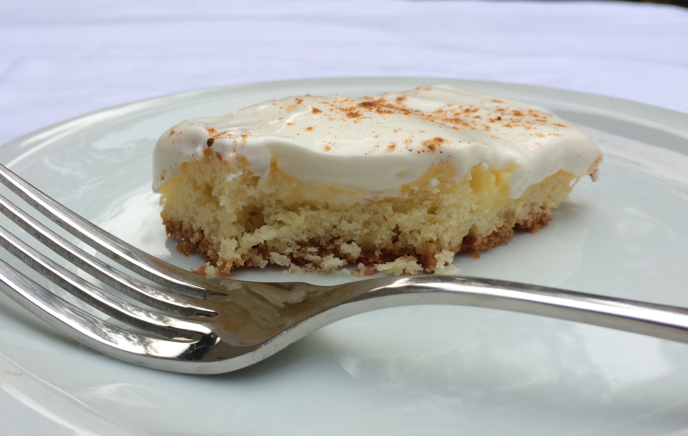 - Preheat the oven to 325° while you make a pudding of the first two ingredients on the stovetop. Remove when thickened, and let cool to lukewarm. Meanwhile, make a dough of the butter, a cup of the sugar, the vanillasugar, eggs, flour, and baking powder. Spread (not pour; this is a thick mixture) the batter evenly as the base of your cake in the baking pan. Spread the cooled pudding ontop, and bake about 45 minutes. Set aside to cool.